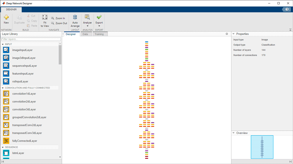Mempercepat pengembangan model pembelajaran mendalam menggunakan aplikasi berkode rendah. Buat, latih, analisis, dan debug jaringan menggunakan aplikasi Deep Network Designer. Sesuaikan dan bandingkan beberapa model menggunakan aplikasi Pengelola Eksperimen.