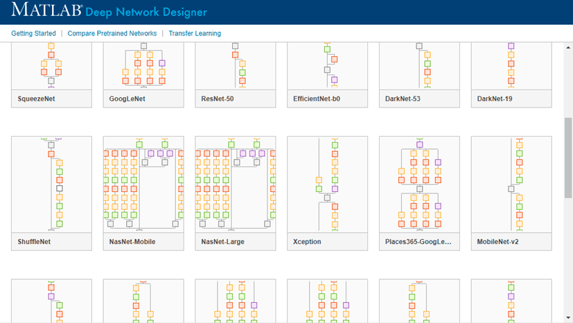 Anda dapat mengimpor jaringan dan grafik lapisan dari TensorFlow™ 2, TensorFlow-Keras, PyTorch®, format model ONNX™ (Open Neural Network Exchange), dan Caffe. Anda juga dapat mengekspor jaringan Deep Learning Toolbox dan grafik lapisan ke TensorFlow 2 dan format model ONNX. Toolbox ini mendukung pembelajaran transfer dengan DarkNet-53, ResNet-50, NASNet, SqueezeNet, dan banyak model terlatih lainnya.
