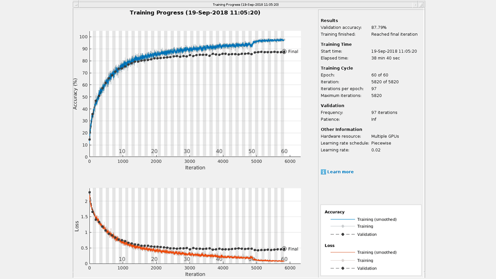 Anda dapat mempercepat pelatihan pada satu atau beberapa stasiun kerja GPU (dengan Parallel Computing Toolbox), atau meningkatkan skala ke klaster dan cloud, termasuk instans NVIDIA®GPU Cloud dan Amazon EC2®GPU (dengan MATLAB Parallel Server).