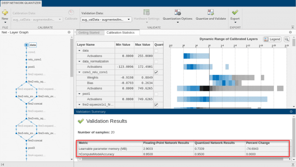 Kuantisasi dan pangkas jaringan pembelajaran mendalam Anda untuk mengurangi penggunaan memori dan meningkatkan kinerja inferensi. Analisis dan visualisasikan trade-off antara peningkatan kinerja dan akurasi inferensi menggunakan aplikasi Deep Network Quantizer.